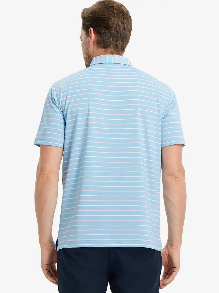 Our men's golf shirt features yarn-dyed stripes and is made from high-end polyester-spandex material, providing softness and breathability. It effectively wicks moisture to keep you cool and dry. With 4-way stretch fabric, this polo ensures full range of motion for any golfer. Ideal for the course or casual wear.