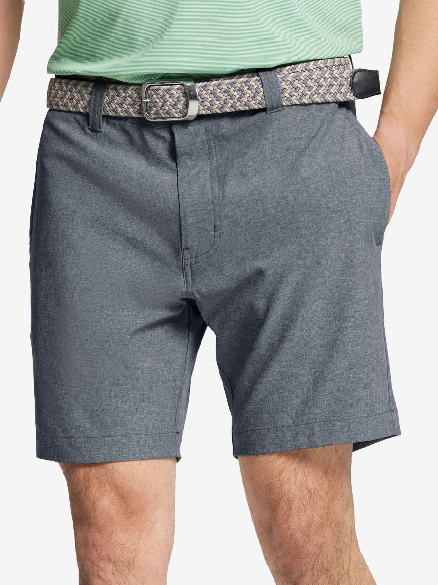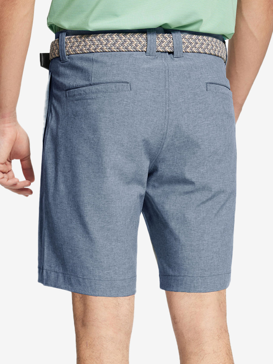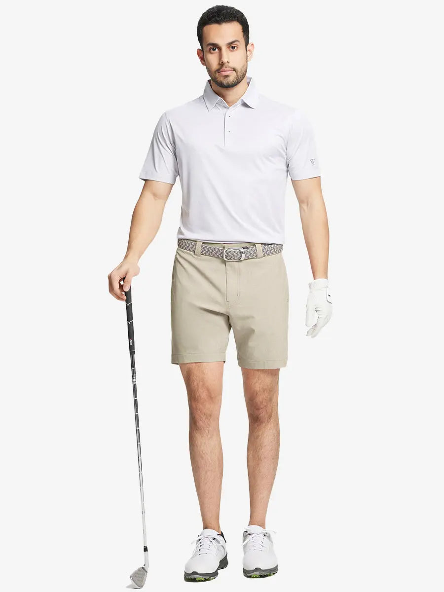 Presentamos nuestros pantalones cortos de golf Heather Performance, diseñados para ofrecer comodidad y flexibilidad con materiales respetuosos con la piel y una excelente elasticidad. Estos pantalones cortos para hombre cuentan con propiedades de absorción de humedad, secado rápido y UPF 50+ para una mayor transpirabilidad y frescura. Mejorados con elegantes detalles jaspeados, son perfectos para el campo de golf o para uso casual, combinando moda con funcionalidad sin esfuerzo.