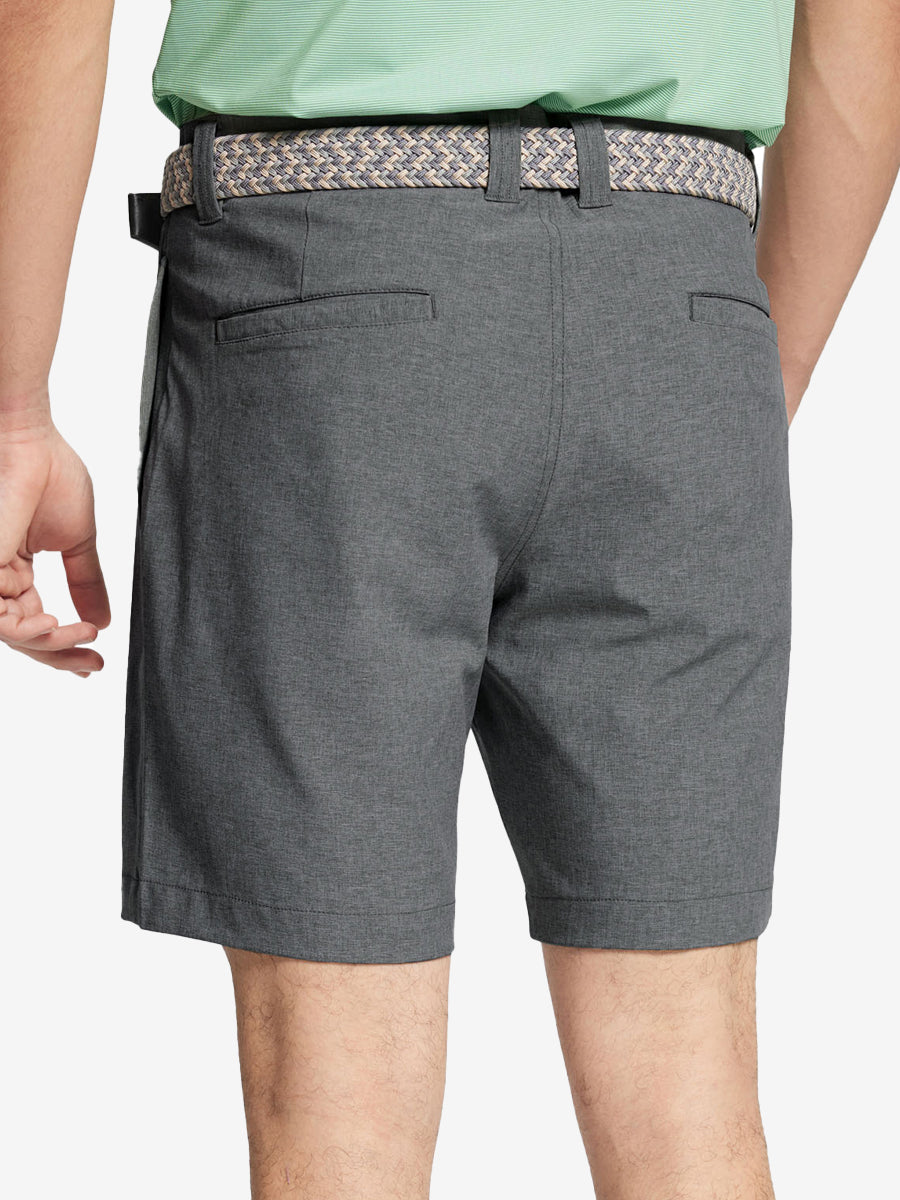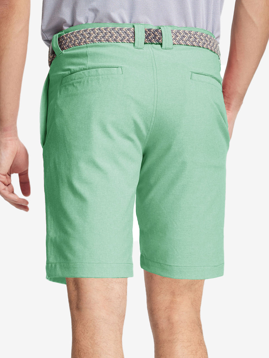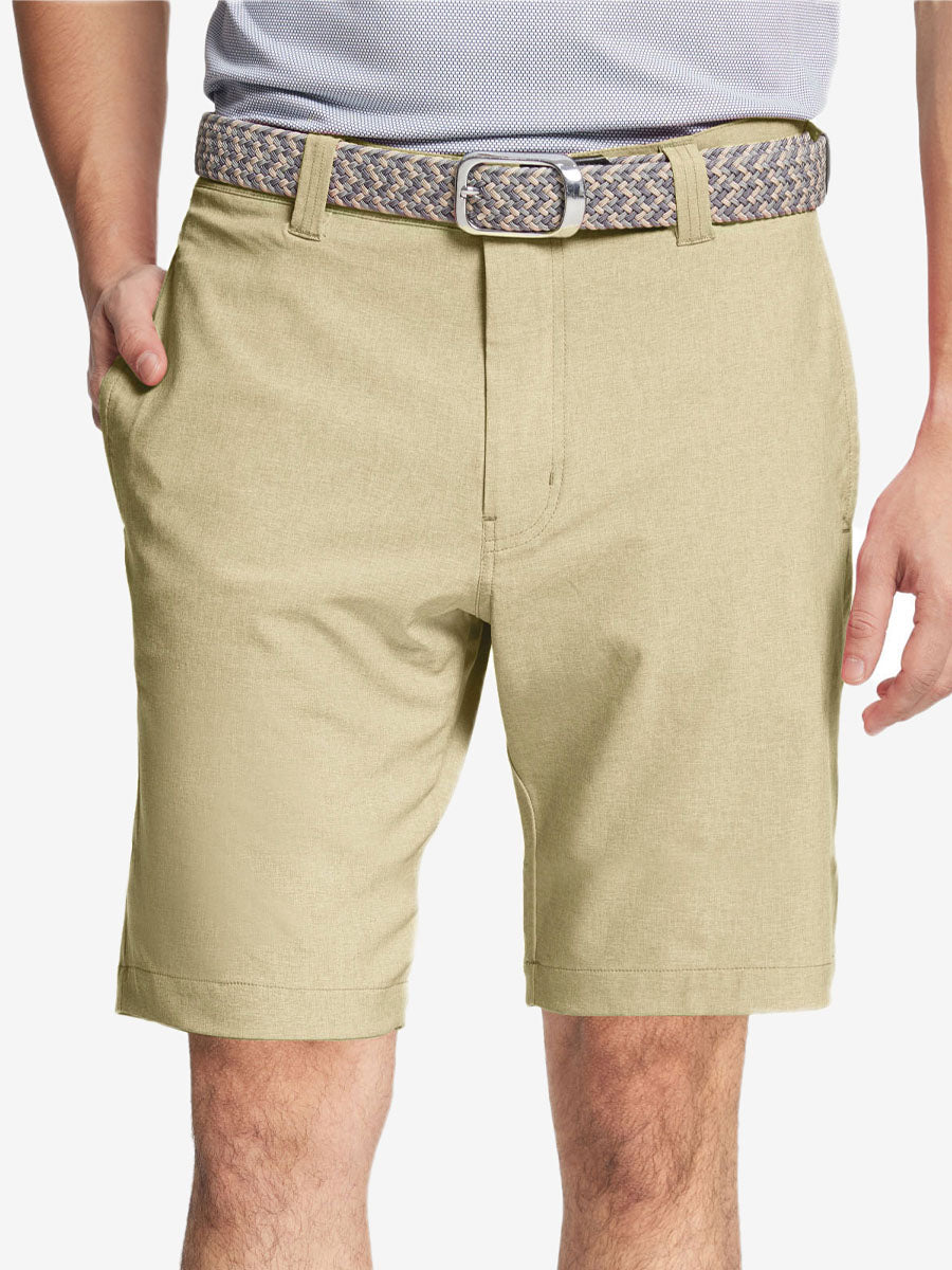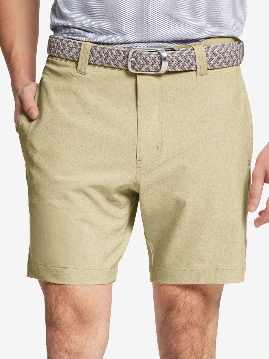 Presentamos nuestros pantalones cortos de golf Heather Performance, diseñados para ofrecer comodidad y flexibilidad con materiales respetuosos con la piel y una excelente elasticidad. Estos pantalones cortos para hombre cuentan con propiedades de absorción de humedad, secado rápido y UPF 50+ para una mayor transpirabilidad y frescura. Mejorados con elegantes detalles jaspeados, son perfectos para el campo de golf o para uso casual, combinando moda con funcionalidad sin esfuerzo.