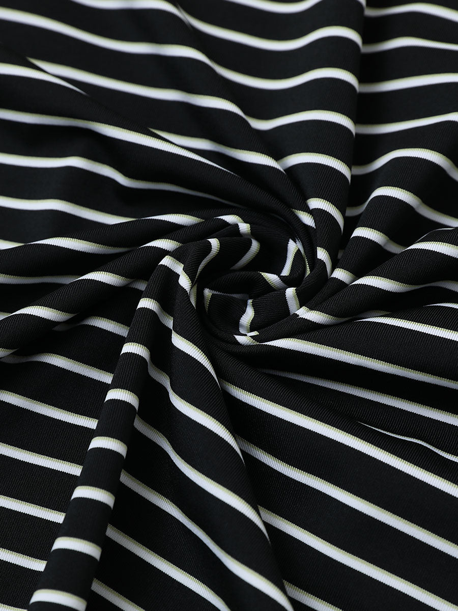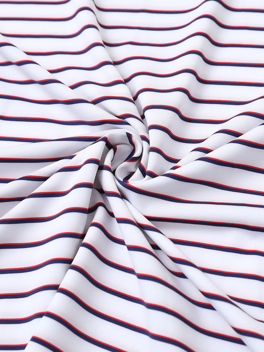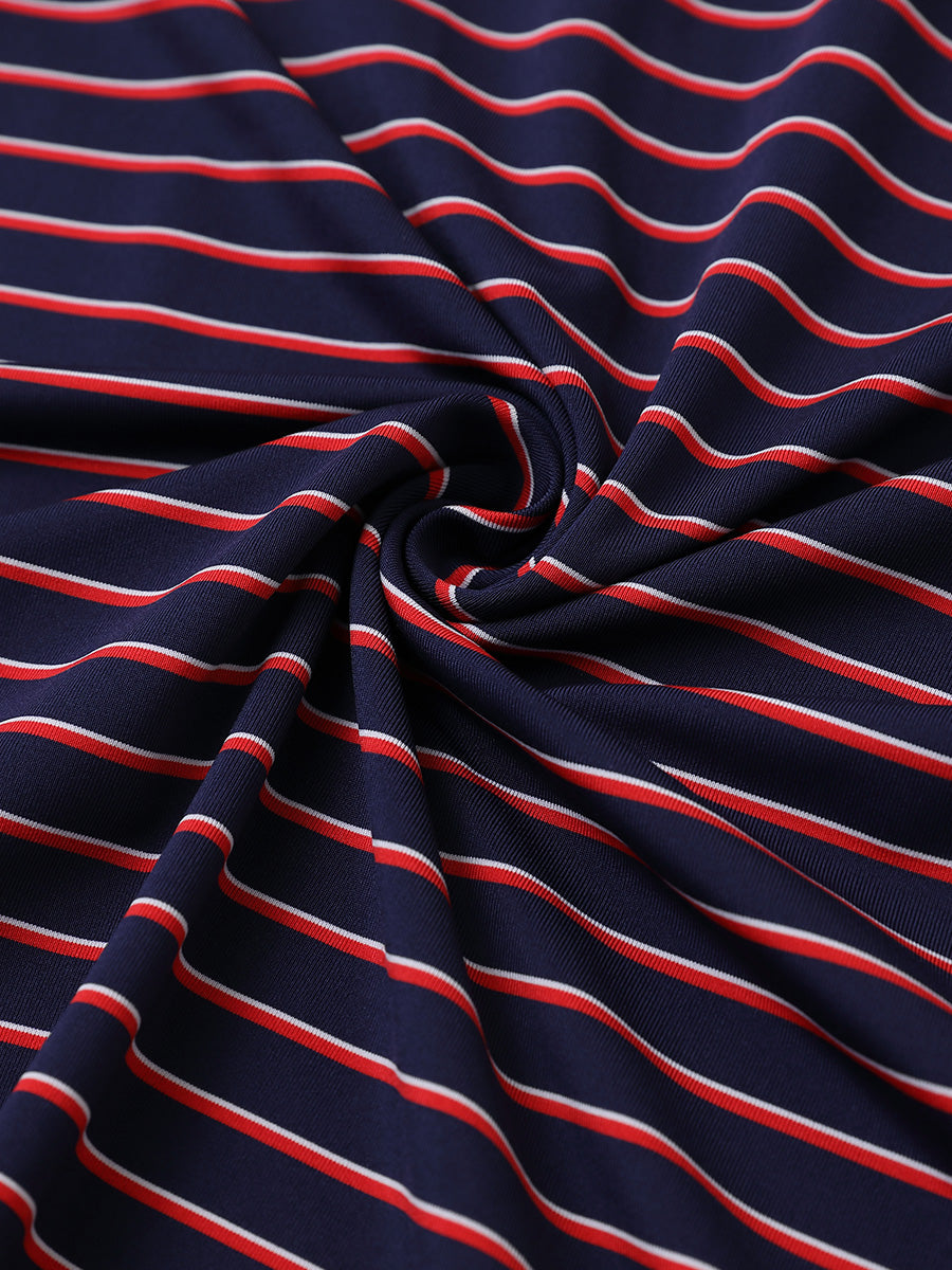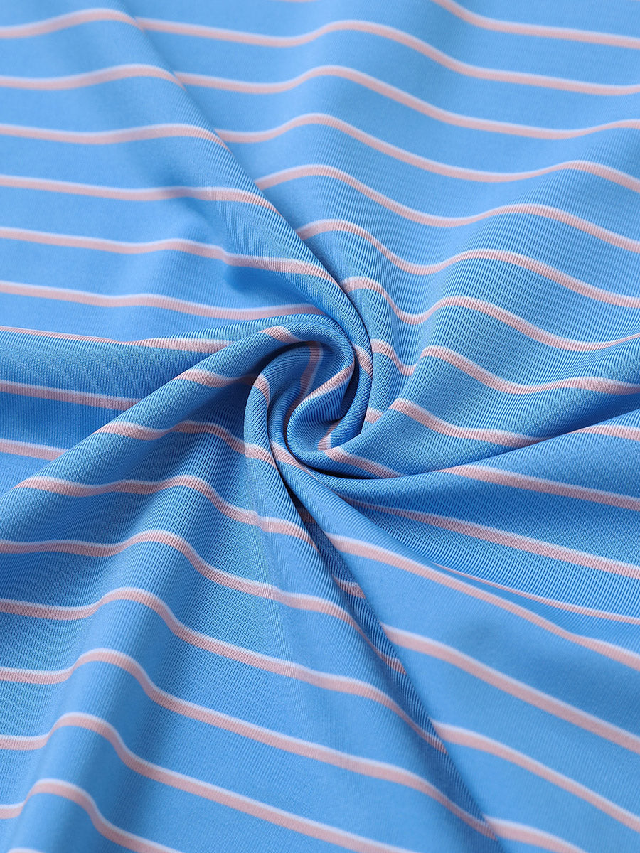 Experience lightweight comfort with moisture-wicking, quick-dry properties, and four-way stretch for enhanced movement. Our men's golf shirt showcases horizontal stripes in two-tone knit, accented by a striking contrast design at the collar and slits, achieving a stylish, unique, and elegant appearance.