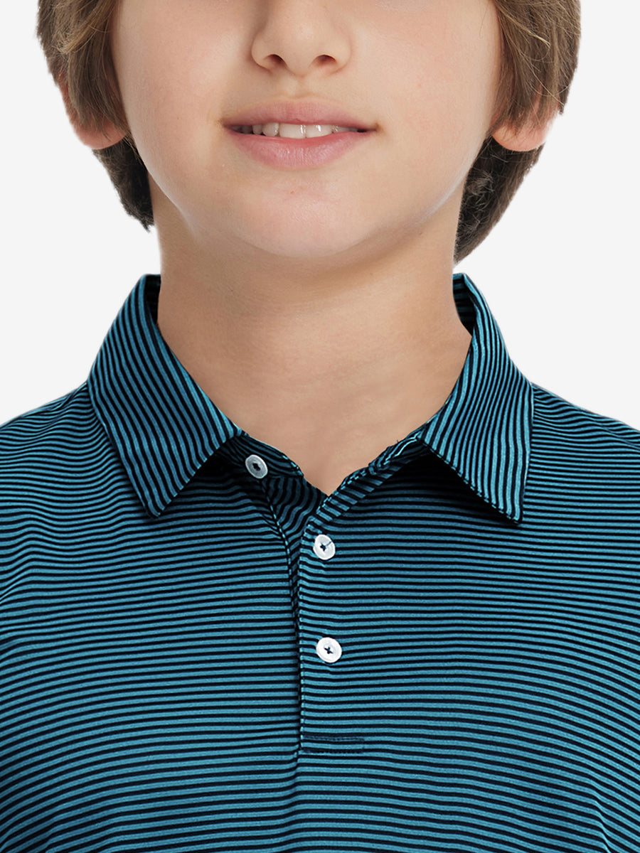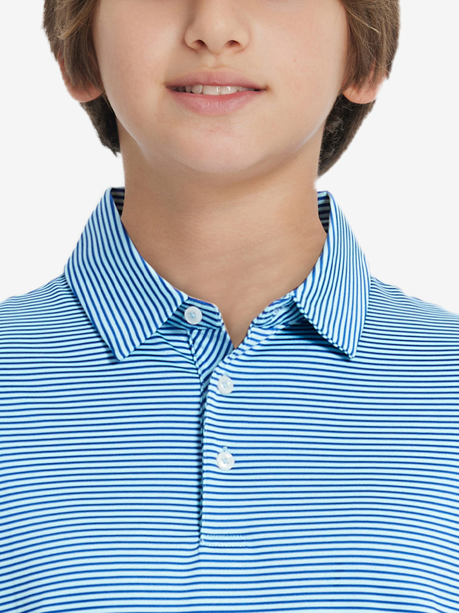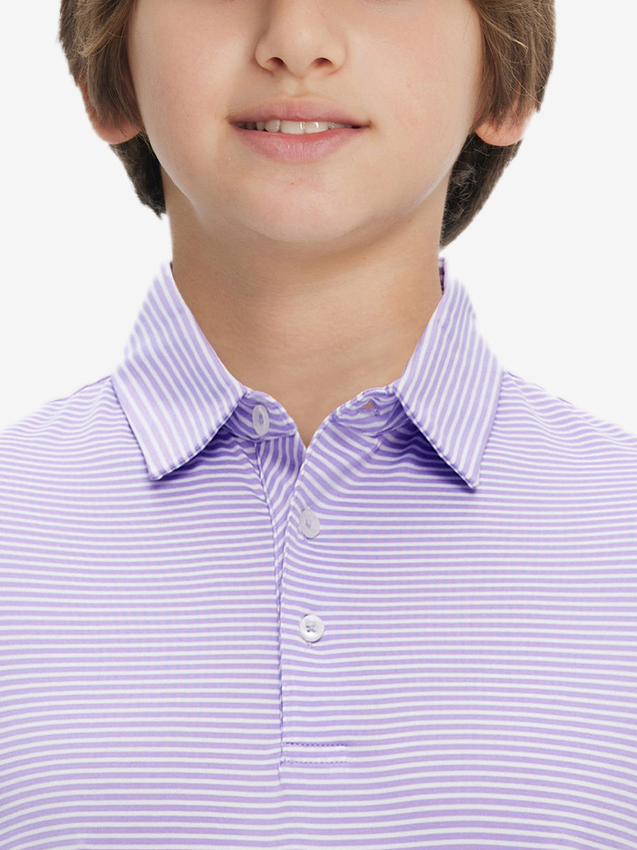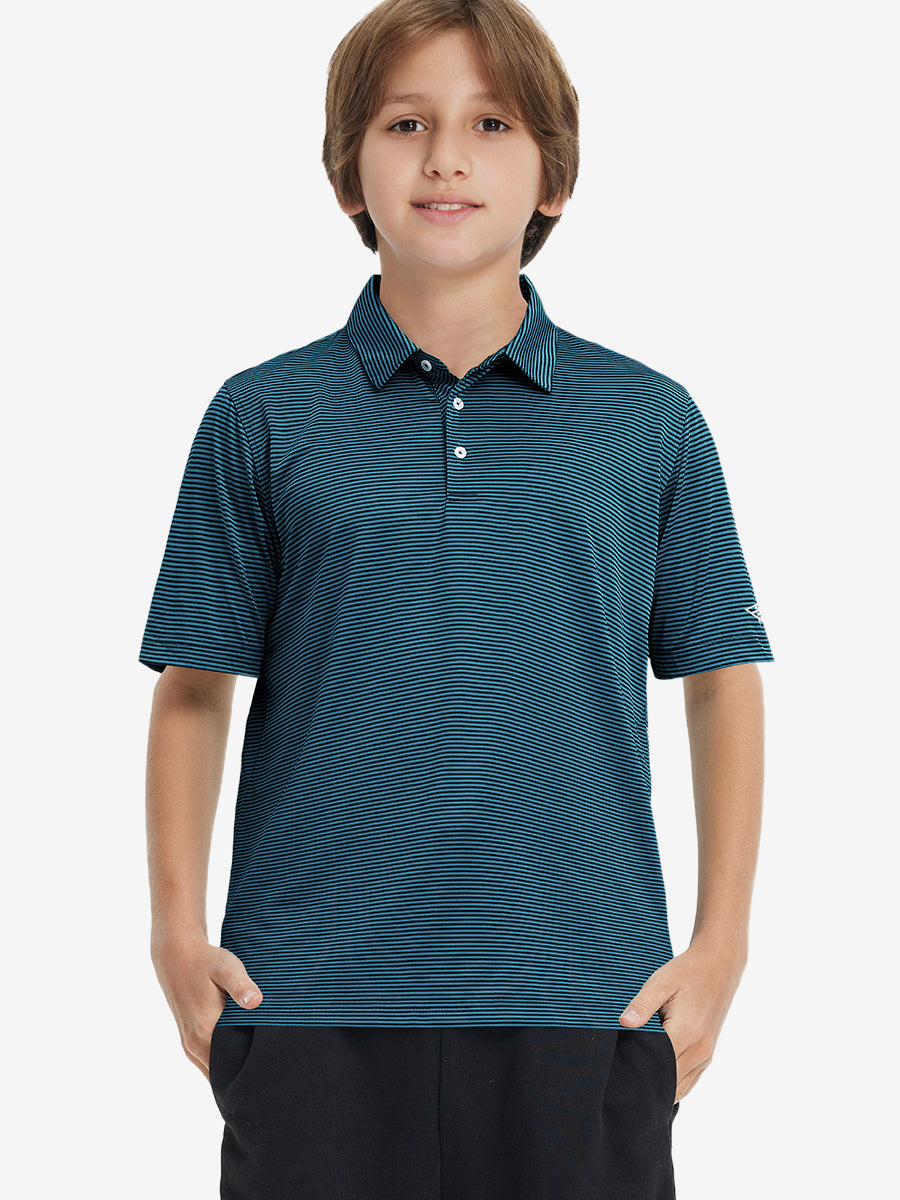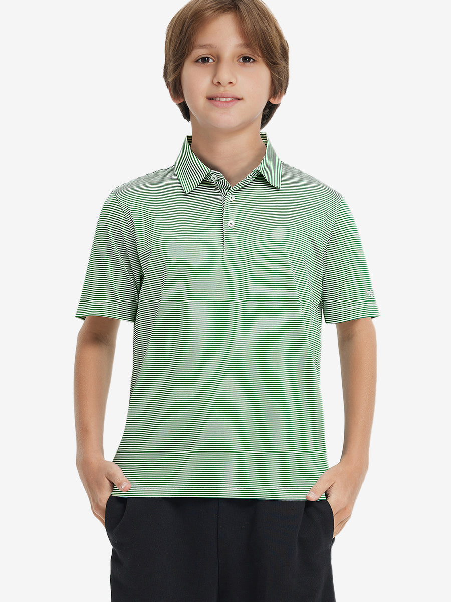 Kids Stripe Golf Polos crafted from polyester spandex striped jersey. Lightweight, moisture-wicking, quick-drying, UPF 50+, soft hand-feel, 4-way stretch for comfort and breathability. Special construction ensures a no-curl collar and maintains shape.