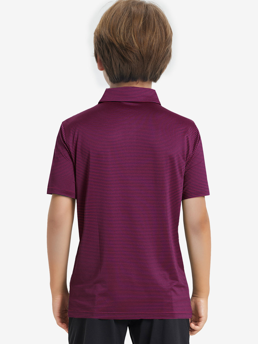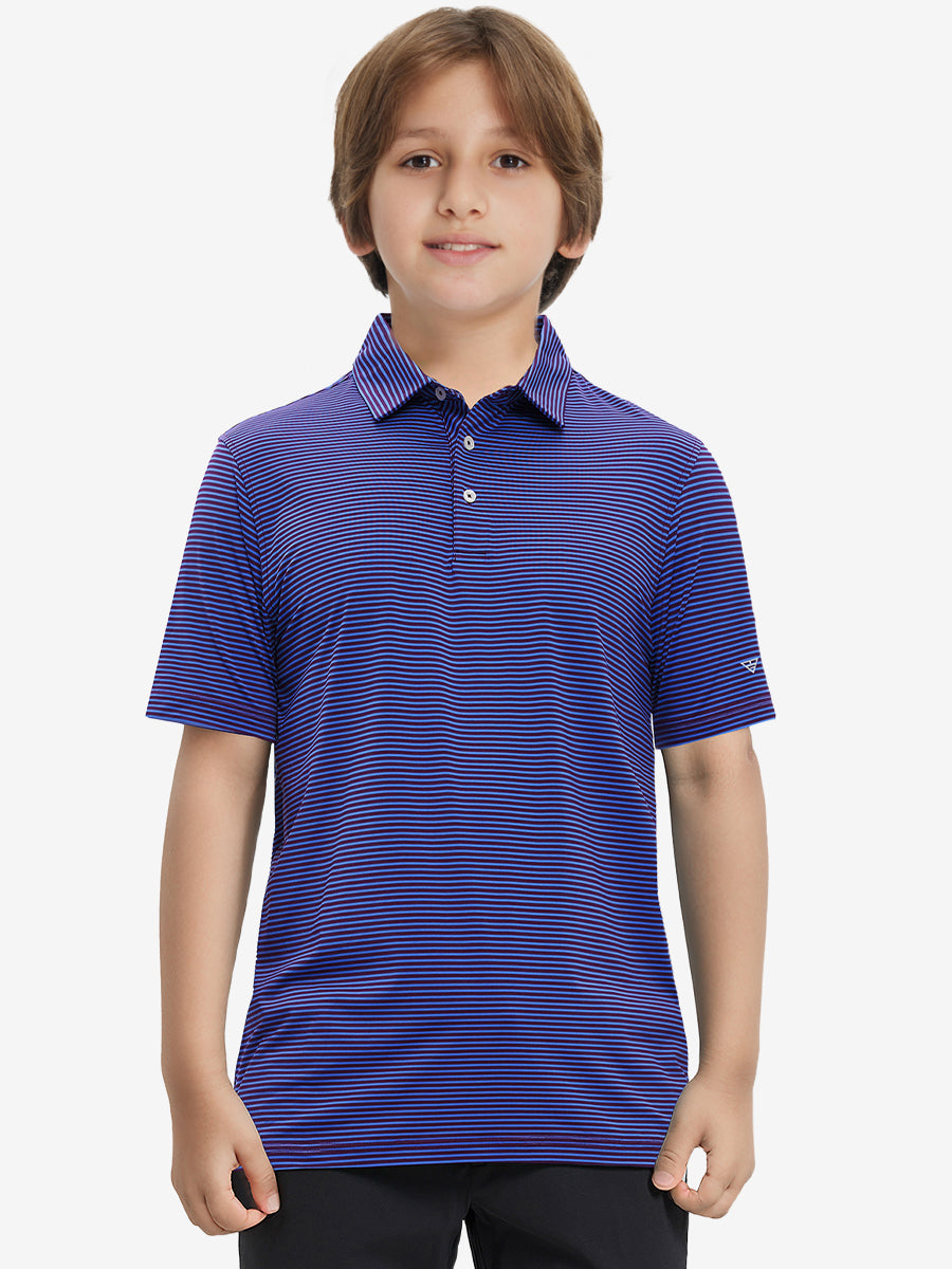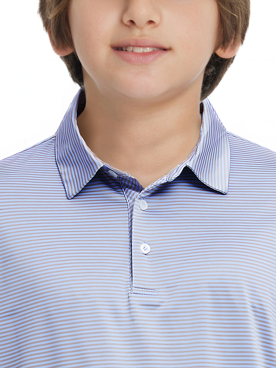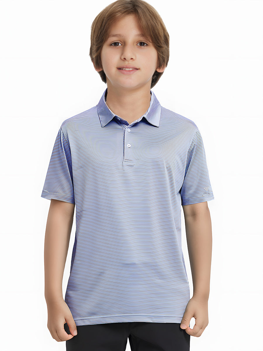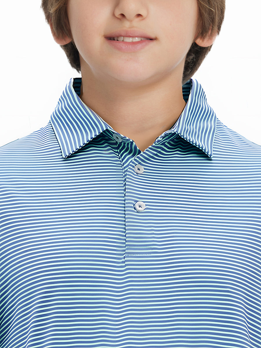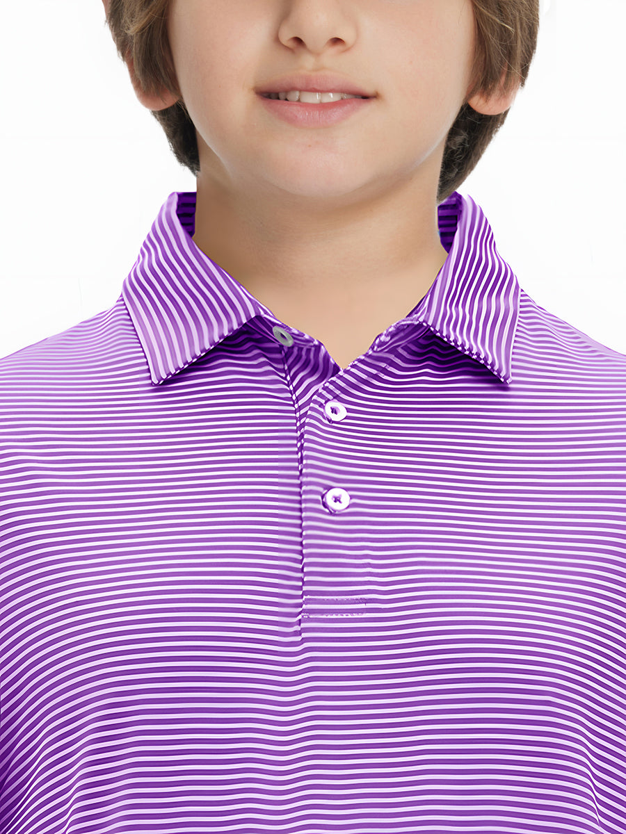 Kids Stripe Golf Polos crafted from polyester spandex striped jersey. Lightweight, moisture-wicking, quick-drying, UPF 50+, soft hand-feel, 4-way stretch for comfort and breathability. Special construction ensures a no-curl collar and maintains shape.
