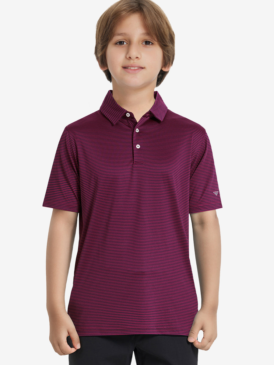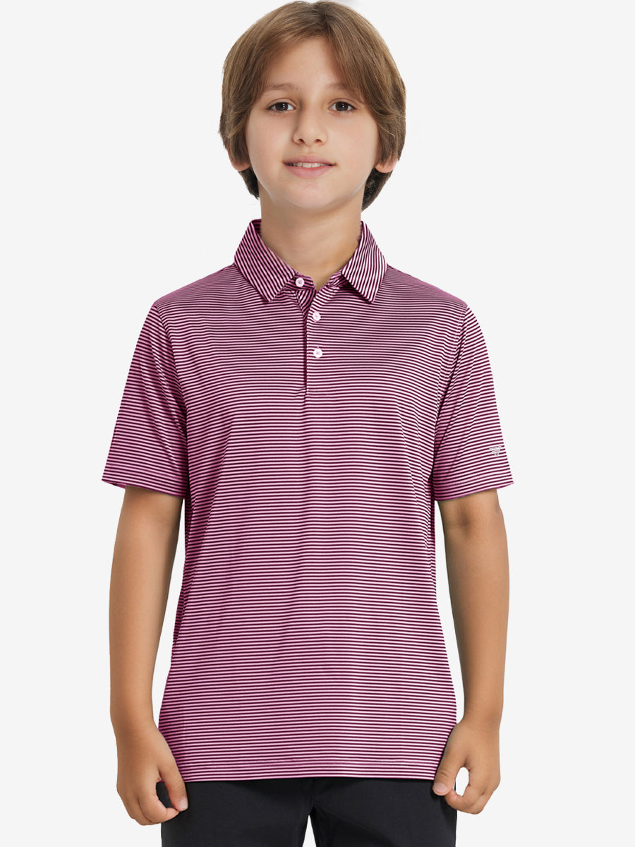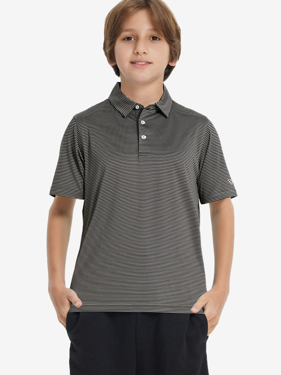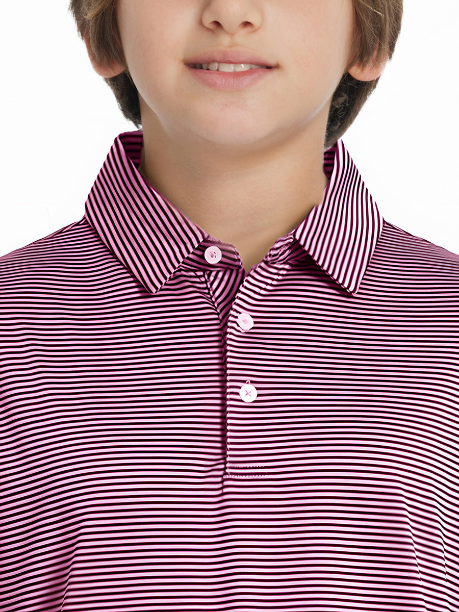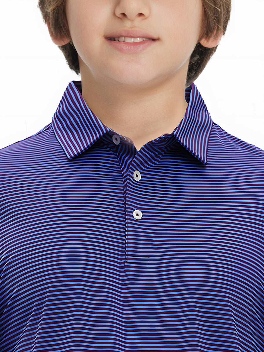 Kids Stripe Golf Polos crafted from polyester spandex striped jersey. Lightweight, moisture-wicking, quick-drying, UPF 50+, soft hand-feel, 4-way stretch for comfort and breathability. Special construction ensures a no-curl collar and maintains shape.