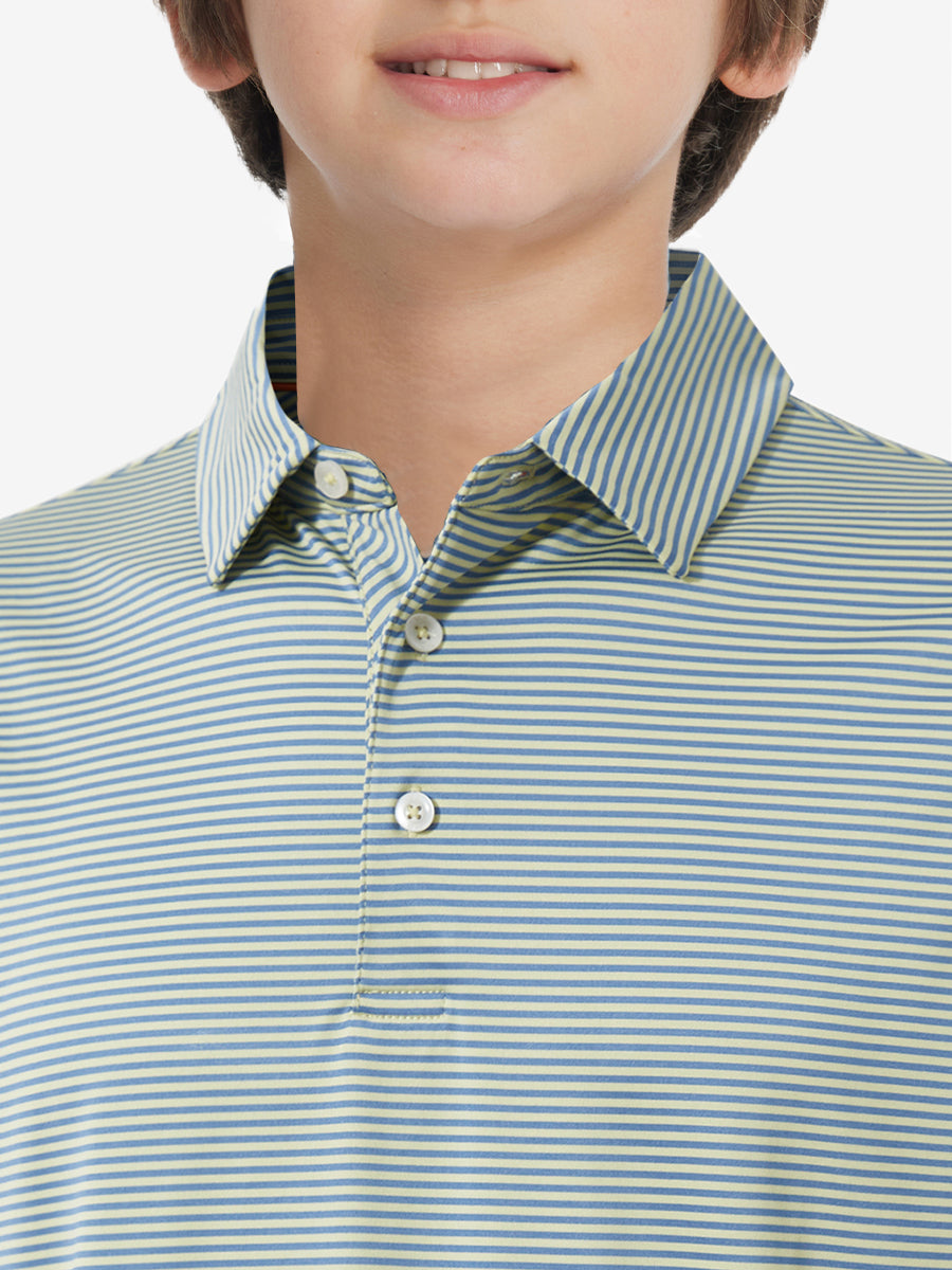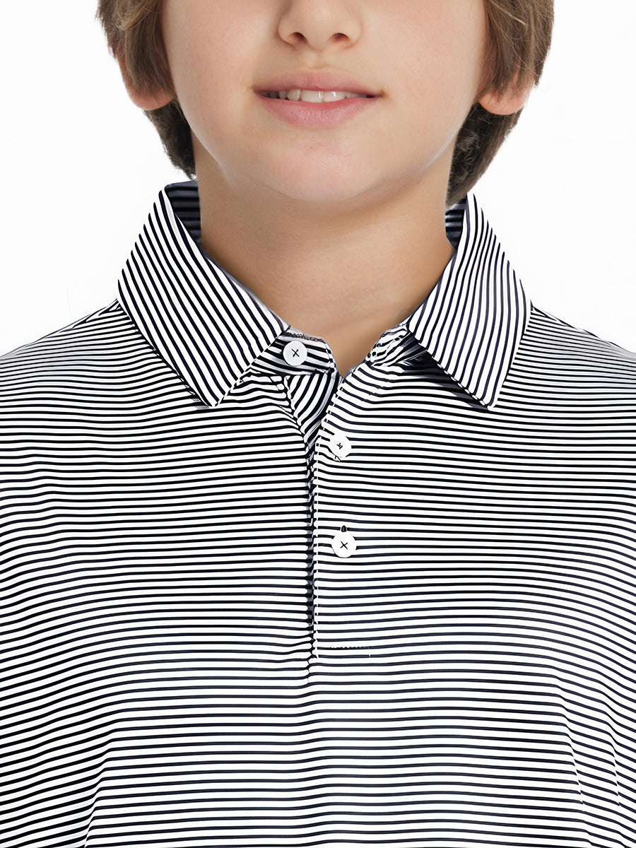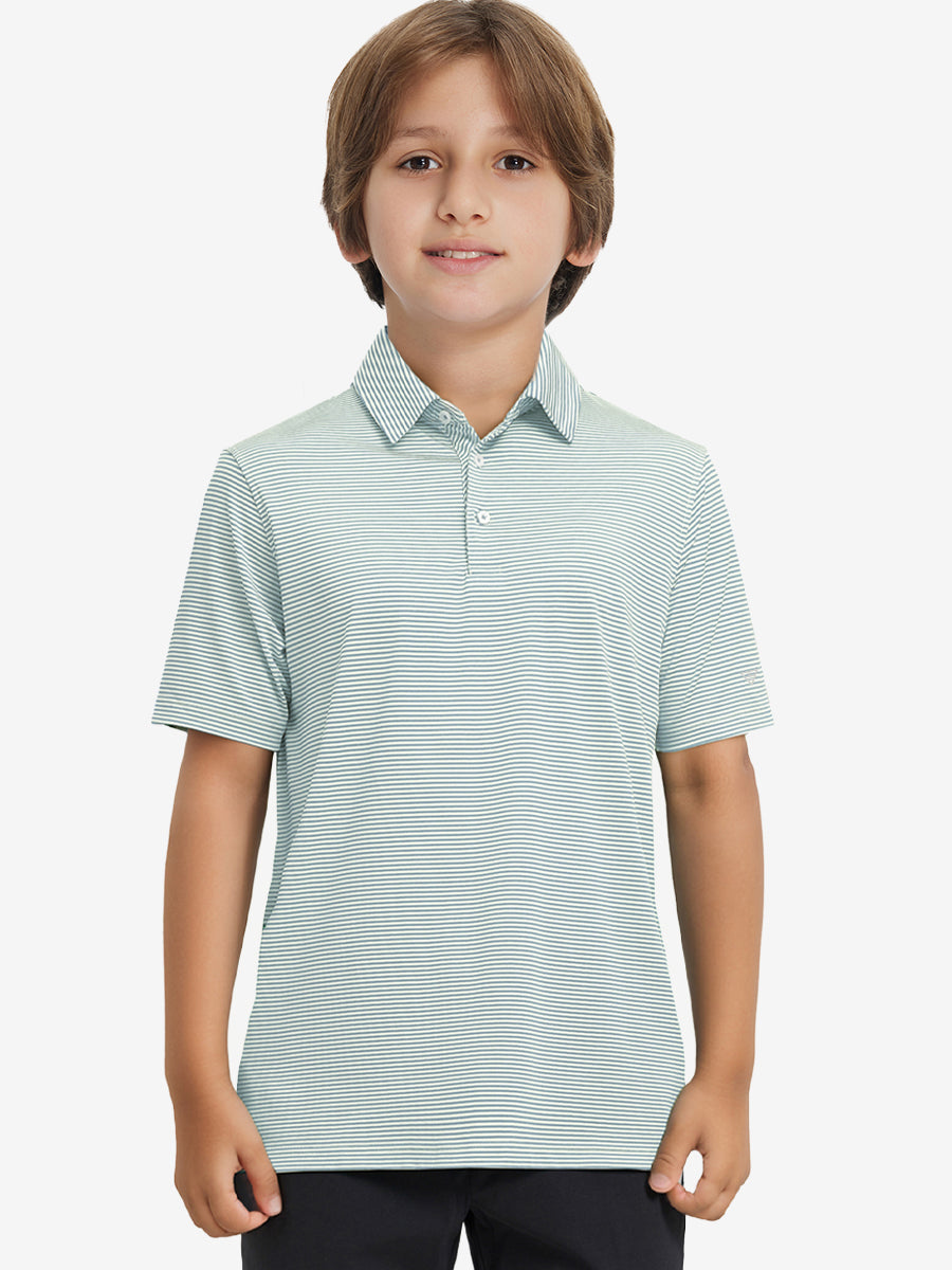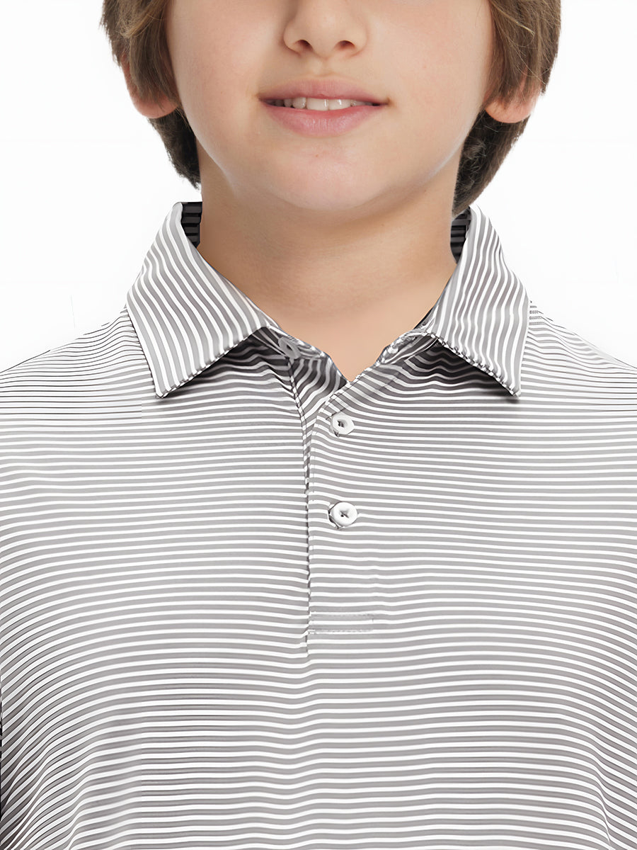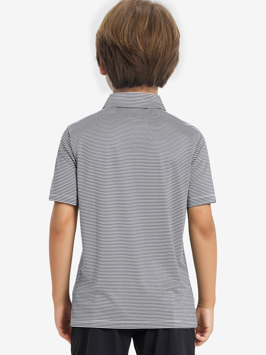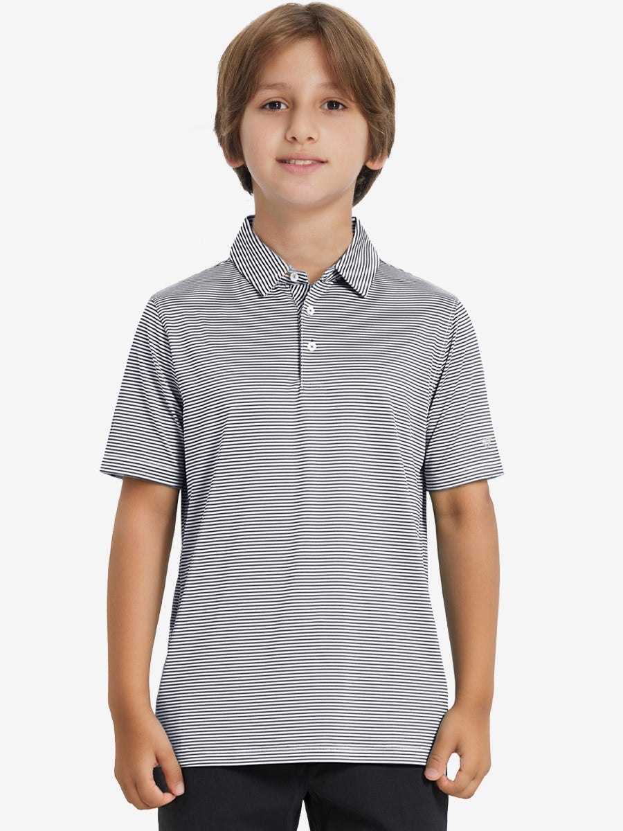 Kids Stripe Golf Polos crafted from polyester spandex striped jersey. Lightweight, moisture-wicking, quick-drying, UPF 50+, soft hand-feel, 4-way stretch for comfort and breathability. Special construction ensures a no-curl collar and maintains shape.